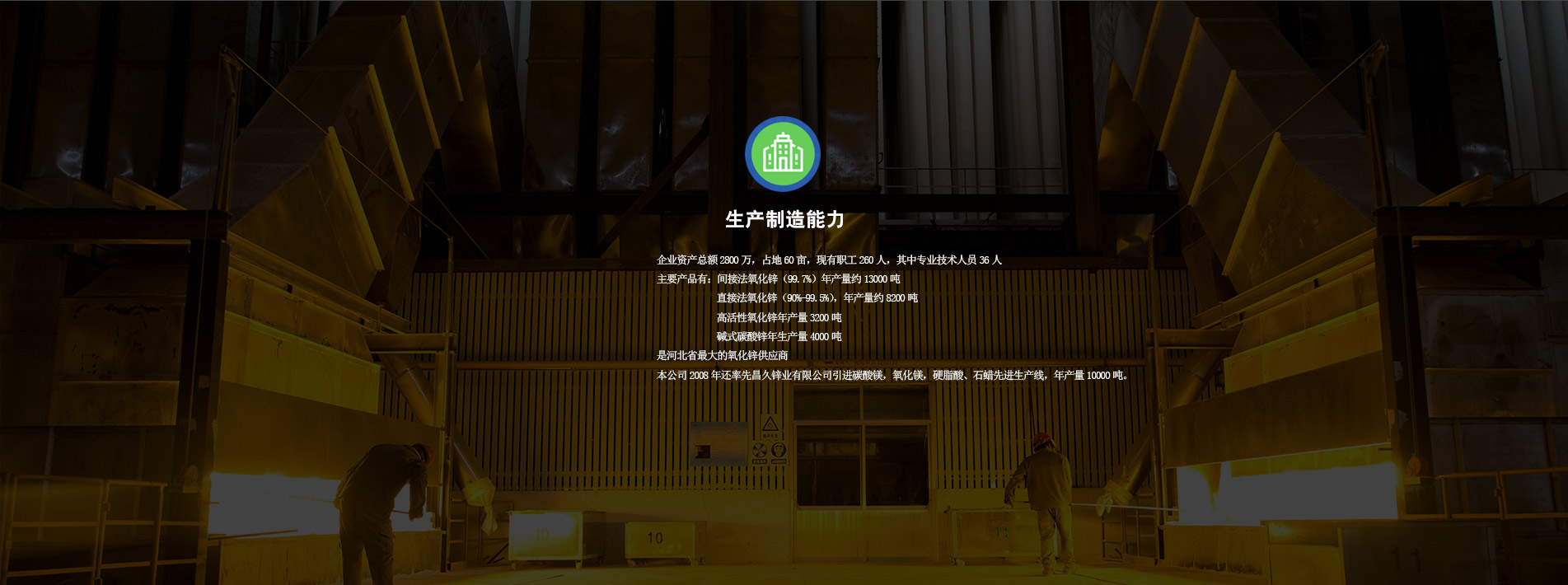 公司創建于1989年,公司座落在美麗的太行山下,107國道、京深高速、京廣鐵路貫穿高邑南北,交通十分便利.地理位置十分優越. 企業資產總額2800萬,占地60畝,現有職工130人,其中專業技術人員16人,主要產品有間接法氧化鋅(99.7%)年產量約10000噸,直接法氧化鋅(90%-99.5%),年產量約5000噸.高活性氧化鋅年產量3000噸,堿式碳酸鋅年生產量3000噸、是河北省氧化鋅優質供應商。本公司2008年還率先引進碳酸鎂,氧化鎂,硬脂酸、石蠟先進生產線,年產量6000噸。